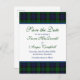 Cartão postal de salvar data de casamento celta com a tonalidade tartã Black Watch escocesa ou Campbell. Esta tonalidade tartã Black Watch é geralmente referida como a tonalidade tartã militar original ou padrão do governo. O design celta da tonalidade tartã Black Watch é o mesmo que a tonalidade tartã oficial Campbell e é considerado uma "tonalidade tartã universal", o que significa que qualquer pessoa é livre para usá-la. Reconecte-se com suas raízes escocesas com um tema de casamento de tonalidade tartã.