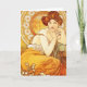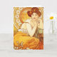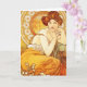 Cartão de saudação Alphonse Mucha Topaz. Pintura a óleo na canvas. O artista checo Alphonse Mucha pintou com frequência alegorias, e Topaz é de uma série representando pedras-de-gema como mulheres bonitas. A pintura apresenta uma jovem linda e jovem vestindo um vestido topaz profundo que fica parado de um fundo joalhado ornamentado. Um presente de excelente para fãs de Mucha, Art Nouveau e impressões de safra.