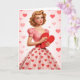 Envie um pouco de romance à moda antiga com este encantador cartão de saudação vintage de Dia dos Namorados. Com uma ilustração clássica inspirada nos anos 50 de uma mulher glamorosa em um vestido rosa com estampa de coração, segurando suavemente um coração de Dia dos Namorados com bolinhas, este design captura a feminilidade atemporal e o amor nostálgico.