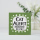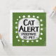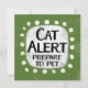 Um design de animais tipográficos irreverente e fofo que diz "Cat Alert, Prepare to Pet". Ele apresenta texto preto e vermelho em um retângulo branco com pontos brancos engraçados e brincalhões ao redor dele, tudo em um fundo de cinza.