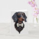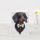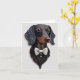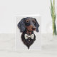Esta carta de boas-vindas apresenta uma imagem digital de um dachshund preto e bronzeado, vestindo uma gravata que foi criada usando a arte digital, no estilo da arte de coloração de papel. A imagem retrata a natureza adorável e encantadora da raça dachshund, e a intrincada técnica de colcha adiciona um toque de sofisticação e elegância ao cartão. O cartão pode ser usado em várias ocasiões, como aniversários, aniversários, ou simplesmente para enviar uma mensagem calorosa a um ente querido que é um entusiasta de dachshund.