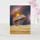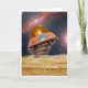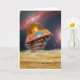 Cartão comemorativo com cena espacial mostrando disco voador de brinquedo retrorreflector.