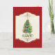 Esta bela trabalho de arte de cor d'água foi pintada por Audrey Jeanne Roberts. O cobrir da frente tem um fundo vermelho de natal com pontos de ouro, uma esplêndida árvore de Natal pintada à mão com uma árvore de estrela, uma faixa de fita e enfeites de natal. Há uma espiral reluzente de ouro e texto de arte vocal "Amor." A estrutura em forma de ouro tem um fundo de rendas macio com ornamentos barrocos rorochas "dourados" para um toque de elegância. O interior é um fundo de renda bordado antigo, pintado com uma mão macia, pintada com uma mão pintada com uma grama de morango holly no topo com um ornamento correspondente de bagas ocas entre o texto do cartão e o nome da sua família.