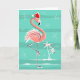 Na moda com um toque retrorreflector com um flamingo rosa festivo vestindo um chapéu vermelho de Santa, estrelas e palmeiras decoradas com bolhas colocadas sobre um fundo de aqua listrado. Um design personalizável para você personalizar com seu próprio texto, imagens e ideias. Uma imagem de arte digital original criada por Quirky Chic.