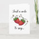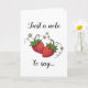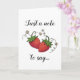 Um cartão alegre com uma ilustração colorida e de verão: um par de morangos vermelhos brilhantes salpicados com caules encaracolados e flores bonitinhas. "Apenas uma nota para dizer..." o script enrola o design. Vazio no dentro.