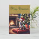 Feliz Natal do seu amigo peludo! Este adorável cartão de Natal mostra um chihuahua vestindo um chapéu de Papai Noel e sentado em frente a uma árvore de Natal. Os olhos grandes e castanhos do cachorro certamente põem um sorriso no seu rosto.