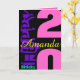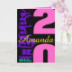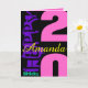 Cartão de saudação personalizável de 20º aniversário com grande número (idade) e nome em cores rosa, roxo, menta e amarelo. Você pode facilmente alterar o texto (cor, fonte, tamanho e posição) clicando no botão personalizar. Estão disponíveis outros modelos.
