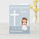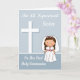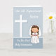 Parabéns a sua irmã pela sua Primeira Comunhão com uma menina adorável vestida de vestido branco com um véu de flor, botões cor-de-rosa e cinto rosa. O fundo é azul com uma cruz branca com sombreado azul claro e texto branco.