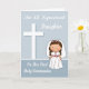Parabéns a sua filha pela sua Primeira Comunhão com uma menina adorável vestida de vestido branco com um véu de flor, botões rosa e cinto rosa. O fundo é azul com uma cruz branca com sombreado azul claro e texto branco.