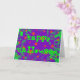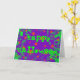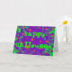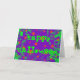 Cartão de saudação com um fundo roxo e verde giratório espalhado por estrelas laranja mágicas e brilhantes e as palavras "Feliz Dia das Bruxas" escritas em verde brilhante. Um design personalizável roxo, verde e laranja para você adicionar seu próprio texto, imagens e ideias. O texto pode ser facilmente alterado usando o modelo fornecido ou clique no botão 'Personalizar o texto' para fazer outras alterações. Envelope correspondente e carimbo de correio disponível. Criado usando técnicas digitais por Jess Perry.