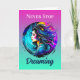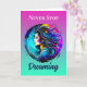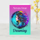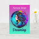 Mulher bonito com arte azul, turquesa, azul, amarela e vermelha colorida ai feita em um vibrador eetéreo místico. Citação inspiradora, "Nunca Pare de Sonhar."