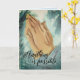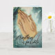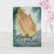 Cartão de saudação dobrado com mãos de oração com fundo azul abstrato. Dentro é azul bebê, vazio esquerdo para sua mensagem motivacional e imagens. Vem em tamanho pequeno e padrão.