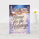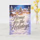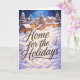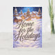 Este cartão de Natal dobrável captura a essência da época natalina com uma paisagem invernal pitoresca. A capa apresenta a frase "Em Casa para as Festas" em elegante letra cursiva, contra um céu noturno estrelado cheio de luzes cintilantes. Abaixo, uma aconchegante cabana de madeira brilha calorosamente, cercada por muita neve fresca e intacta que cobre telhados, árvores e o caminho sinuoso que leva à porta.