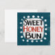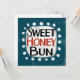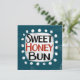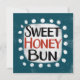 Uma design de comida tipográfica bonita que diz "Docinho de Mel". É texto preto e vermelho em um retângulo branco com pontos brancos engraçados e brincalhões ao seu redor, todos sobre um fundo lacrimogêneo.