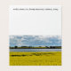 Um campo de canola amarela vibrante floresce sob um céu dinâmico, com manchas de nuvens fluffy lançando sombras na paisagem. Ao fundo, uma banda contrastante de árvores verdes escuras separa o campo de uma extensão tranquila de água. Esta imagem foi tirada perto de Streatham em Victoria, Austrália.
