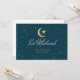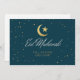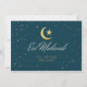 O cartão de saudação plano Eid Mubarak apresenta uma crescente ouro e estrela com estrelas pequenas dispersas.