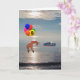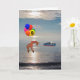 Girafa está pendurada abaixo de balões coloridos. Altere o número no balão amarelo para refletir a idade do destinatário. Girafa está voando sobre o oceano em direção a um cargueiro. A luz do sol brilha através das nuvens e reflete sobre a água. A saudação de dentro diz "Entregando Aniversário Deseja a Você" - Pode ser alterada.