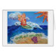 A pintura mostra um anjo surfando laranja brilhante em um oceano azul com um sol brilhante. A água do mar avança sobre a areia que rodeia as palavras "Limpar Cancer". Há uma concha rosa na praia. A pintura foi feita em acrílico e aspergida com brilho para textura e brilho. Faça cartões de saudação personalizados para mensagens personalizadas de bem-estar.
