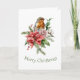 Um Robin entre uma poinsettia e um cartão de saudação de Natal rosa e verde.