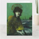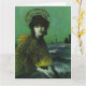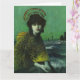 Este cartão de saudação é ilustrado com uma sirene melancólica adornada com uma morada de ornamentado virada para fora, colocada contra um mar turbulento com um naufrágio no fundo. Seu traje apresenta uma escala vibrante como padrões, criando um contraste com as águas tempestuosas e o céu escurecido. Esta trabalho de arte em tons verdes e temperados foi pintada em acrílico com algodão.