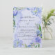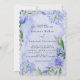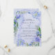 O design apresenta uma estampa colorida com elemento floral em tons de roxo e azul poeirento sobre um ramo de folhas verdes em forma de grinalda e flores de peônia, tulipa e jacinto sobre um fundo de aquarela lilás claro e azul claro. Ótimo para as suas celebrações de casamento!