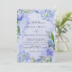 O design apresenta uma estampa colorida com elemento floral em tons de roxo e azul poeirento sobre um ramo de folhas verdes em forma de grinalda e flores de peônia, tulipa e jacintos sobre um fundo de aquarela lilás claro e azul claro. Ótimo para as celebrações do seu casamento!