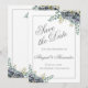 O design apresenta um buquê de hortênsias purpúreas com um buquê de folhagem de eucalipto com uma borda cinza claro. Combina com a nossa coleção de convites de casamento correspondentes.