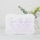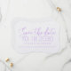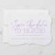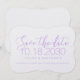 Cartão de Save the Date simples, minimalista, liso e sem foto, em um formato elegante de parênteses recortados em lilás, orquídea roxa e branco, com tipografia elegante em script e números de data grandes em uma fonte sans-serif sofisticada. Personalize o modelo escolhendo as cores e fontes desejadas para os seus anúncios de casamento.