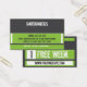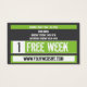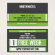 Cartão de Semana Sem Cartão de visita de Arte Marcial misto com um esquema de cores verde e escuro para cinzas, um esquema de design moderno e fortes elementos de tipografia. A parte traseira do cartão tem espaço reservado de semana livre. Espaço para adicionar suas aulas, horário de ginásio ou qualquer outra informação pertinente. Forma perfeita de encorajar a participação de classes e uma ferramenta de marketing fácil. Perfeito para um ginásio de artes marciais mistas, ginásio de boxe, ginásio de kickboxing, krav maga, ou estúdio de artes marciais.