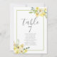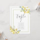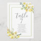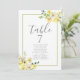 Delicar as flores amarelas da aquarela decoram este lindo número da mesa de casamento no verão com o cartão de assento. A decoração do casamento do jardim é acentuada com uma suave borda verde retangular verde e folhas botânicas sob os elegantes e ensolarados. Floral e leve, perfeito para uma cerimônia ao ar livre.