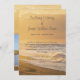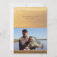 Cena do oceano, serviço memorial personalizado/cartões de aviso de funeral. Personalize este design unisex em ambos os lados com uma foto e um texto. No topo, figura a menção "Na memória amorosa de [nome]". Incluir datas de nascimento e morte e um parágrafo de texto. Mais texto pode ser adicionado à parte de trás acima da área de fotos. A cor é um nascer do sol ouro / pôr do sol sobre uma praia. A design é destinada a um barco, marinheiro, pescador e qualquer amante do oceano, homem ou fêmea.