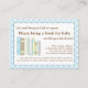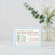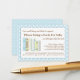 Um poema encantador solicita que os convidados tragam um livro para o futuro bebê para começar a nova mãe com uma biblioteca de livros infantis amados. Basta inserir este doce dentro do envelope do chá de fraldas. O adorável esquema de cores azul-bebê, amarelo e hortelã com uma fileira bonita de livros correspondentes faz um design perfeito para coordenar com quase qualquer convite para um chá de fraldas para um menino.