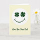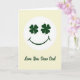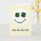 Este cartão mostra um rosto sorridente estilizado centrado perto do topo, com dois trevos de quatro folhas servindo como seus olhos em um verde esmeralda profundo ☘️. O rosto está dentro de um círculo branco brilhante que se destaca contra um fundo amarelo pálido e suave, dando a toda a cena um visual suave e ensolarado. Aqueles “olhos” de trevo parecem um olhar amigável, como se o sorriso estivesse olhando carinhosamente para alguém de quem gosta 💚. Abaixo do círculo, as palavras “Amor por Você, Querido Pai” estão escritas em um estilo cursivo fluído, dispostas na metade inferior do design. A letra aparece em um tom verde escuro que combina com os trevos, ligando o texto de forma harmoniosa à imagem principal. Com muito espaço aberto e formas simples, o layout mantém a atenção no rosto sorridente e na mensagem abaixo. O círculo branco tem bordas n