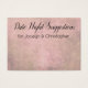 Aqui está um acessório divertido para pegar sua festa de noivado ou chá: cartões de sugestão noturnos de data nos quais os convidados podem escrever notas pessoais para a noiva e o noivo. Na frente você lê "Sugestões da Noite de Data" em uma fonte elegante e moderna de script; esta fonte é editável para que você possa escolher outra se preferir... ou até escrever uma mensagem diferente. Abaixo tem um lugar para seus nomes. Todas as palavras são apresentadas em preto. Tanto a frente como a parte traseira da placa estavam cobertas por uma sutil e angustiada imagem escura que apresenta designs e burlap laces sutis, juntamente com elementos rosa e bege. A textura estava coberta por uma camada branca opaca destinada a clarear a superfície e a fornecer bastante contraste para o texto impresso e escrito na superfície. O verso foi deixado sem palavras, fornecendo um espaço para anotações manuscritas pessoais mais longas que seus hóspedes são encorajados a fornecer. Por favor, não hesite em contactar-me se tiver pedidos especiais ou necessitar de outros pontos. Também me apraz ajudar na personalização destes cartões, se for necessário. // Concebida por Melody Watson para Paper Muserie