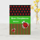 Um design de cartão de aniversário moderno em italiano que você pode personalizar para o receptor. O esquema de cores é vermelho, verde, preto e branco, há padrões coordenadores de ladybugs e listras na frente e mais um dentro de ladybug. Digite nas caixas para mudar a saudação na frente "Buon complementanno", o nome, e a dentro "Ti auguro giornata piena di felicità e un anno pieno di gioia" (= "Desejar um cheio dia de felicidade e um ano cheio de alegria"). Dentro, há um padrão delicado de corações dispersos em um fundo verde pálido. Quer os chame de joaninha ou pássaro-da-joia, eles são símbolos de boa sorte, então envie alguns desejos de aniversário de sorte a alguém que você ama!
