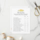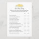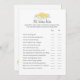 Um jogo divertido para a festa de revelação de gênero é o jogo dos contos de esposas antigas. Este cartão de jogo apresenta florais amarelos no topo. Ao contrário, está um ursinho de pelúcia que se inclina sobre um barril de mel observando uma abelha de mel com modelos.