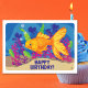 Um rico-dourado num aquário com plantas e areia de cor brilhante. As cores incluem laranja, azul, roxo, bronzeado e rosa. Este cartão de aniversário é perfeito para quem ama o passatempo da conservação de peixes. Dentro: Vazio