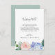 Este elegante casamento de hydrangea azul desejando um bom cartão é perfeito para um casamento de primavera ou verão. O clássico design floral apresenta faixas de cor azul-d-água de pó macio, acentuadas com flores cor-de-rosa e folhas verdes, cor-de-rosa e borrado neutro. Personalize este cartão de convite com os seus nomes e um poema de boas intenções.