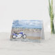 Um motociclo azul em pé numa praia com nuvens fofinhas no céu. Viagem segura escrita em rocha refletida na água deitada na areia.