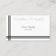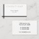 Dois bares pretos no lado esquerdo e na parte inferior formam um quadro para o nome da empresa branco-em-branco, e seu nome e título na cinza. A parte de trás é branca e tem espaço para mais informações. Facilmente adaptável para uma grande variedade de profissões: negócios, finanças, manufatura, lei, saúde, arte e muito mais.