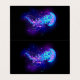 Água-viva grande, azul, desenhada artisticamente, brilhante, brilhante, com longos tentáculos sobre fundo preto com bioluminescência roxa. Água-viva luminosa.