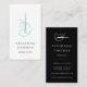 Cartões de visitas verticais elegantes para costureiras, desenhadores de moda, estilistas, alfaiates e outros apresentam uma agulha de costura e um fio em aqua de turquesa vibrante com duas linhas de texto personalizado sob preto nítido. Personalize o verso com os detalhes de contato do seu cheio em letras brancas em um fundo preto, sob uma ilustração de agulha de costura correspondente.