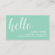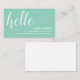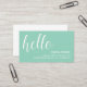 Um cartão de visita de lado simples em verde-menta e branco com olá escrito em um roteiro de caligrafia elegante.
