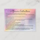 Esta simples e glamourosa pálpebra com extensões após as instruções cartão de visita é perfeita para uma empresária profissional na moda e moderna. Ela apresenta um arco-íris cintilante (púrpura, rosa, amarela e azul) impresso falso (cor-de-rosa, amarelo e azul) esculpido de unicórnio com tipografia cursiva escrita a preto. É elegante, giro, giro, bonito, chique, moda e legal. ***NOTA DE DESIGN IMPORTANTE: Para qualquer solicitação de design personalizada, como solicitações de correspondência de produtos, alterações de cor, mudanças de posicionamento ou qualquer outra solicitação de alteração, clique no botão "mensagem" ou envie um e-mail ao designer diretamente em lafemme.art@gmail.com. Você pode até enviar um e-mail para ela solicitando um design completamente personalizado e novo.