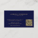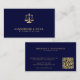 Simple minimalist lawyer attorney at law navy blue and gold business card with scales of justice logo, QR code, and modern typography. Suitable for a law firm, professional legal practitioner, judge, solicitor, or consultant.