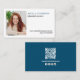 Um simples design apresenta um modelo de cartão de negócios de código QR, com uma fotografia simples, e um estilo profissional moderno, com um código de barras digitalizável para um site ou mídia social como Instagram e Facebook, um design de chic minimalista e moderado, com detalhes mínimos de contato, e um fundo azul limpo no verso, um cartão de visita de texto de fotografia.
