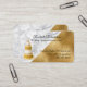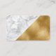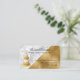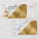 Casamento elegante e cartão de visita de bolo de ocasião especial feito em meio mármore moderno e meio tom de ouro. Uma foto de um bolo de casamento branco e de ouro decora o canto inferior esquerdo da carta. O texto preto personalizado está pronto para personalizar o seu negócio de padaria.