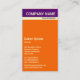 Um modelo de cartão de negócios vertical com um cabeçalho roxo coberto com uma banda creme. Todos os detalhes na frente com o vazio à esquerda, que pode ser deixado como está ou mais personalizado. A design permite também espaço de sobra para a adição de outros elementos, por exemplo, um logótipo.