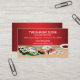 Este cartão de negócio da restauração do bar de sushi mostra uma variedade larga do sushi em uma mesa que espera um cliente. A informação do negócio imprime contra um inclinação vermelho brilhante. Adicione um nome e um título junto com a informação extra no reverso. Disponível com produtos de harmonização.