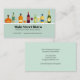Diversas garrafas de álcool e bebidas são exibidas em um balcão em estilo retrô, ilustrativo nesse cartão de visita. Utilização para um bar, bar, restaurante, bistro, loja de bebidas, venda a retalho de álcool ou grossista, ou outra atividade comercial. Disponível com itens correspondentes.